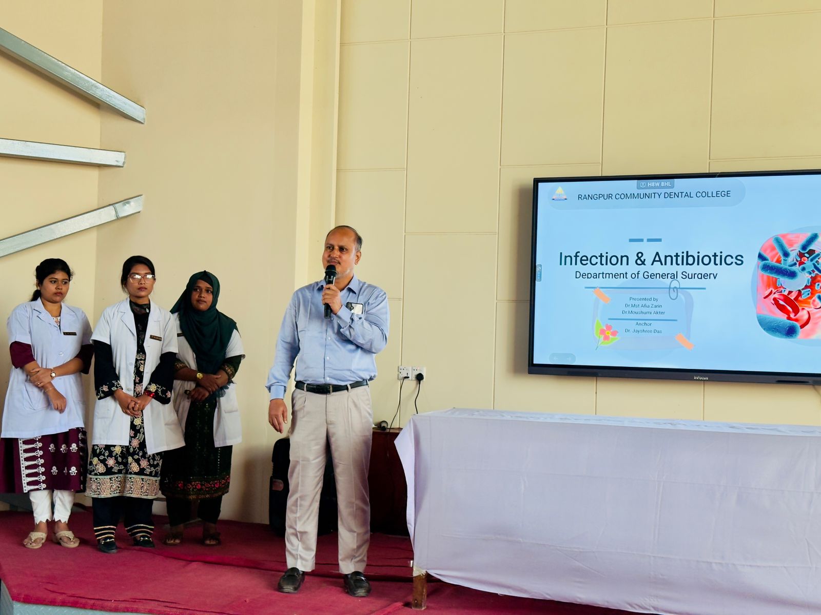 CME on the topic of "INFECTION AND ANTIBIOTICS"   Organized by: Department of General Surgery, Rangpur Community Dental College and Hospital on 19th November 2025. Respected Professors, Lecturers, Medical Officers, and Intern Doctors have cordially arrived at the scheduled time to attend a scientific seminar organised by...