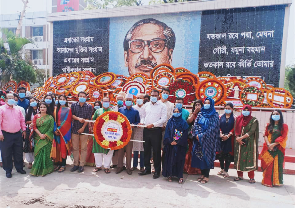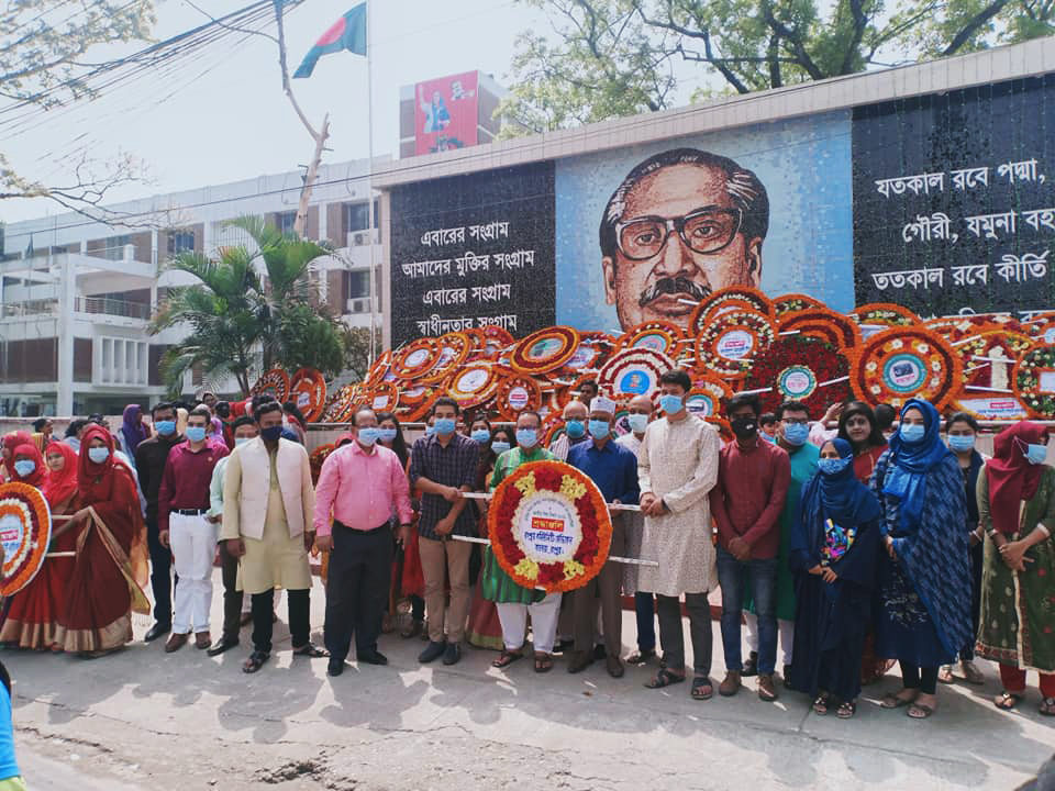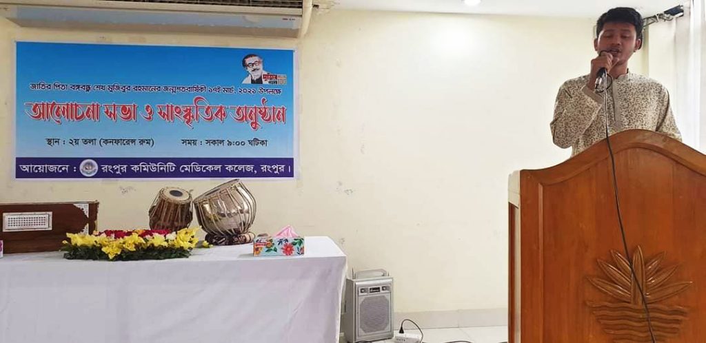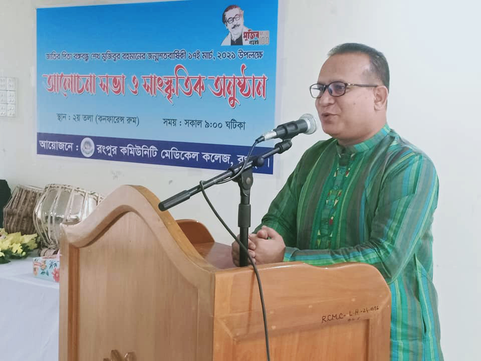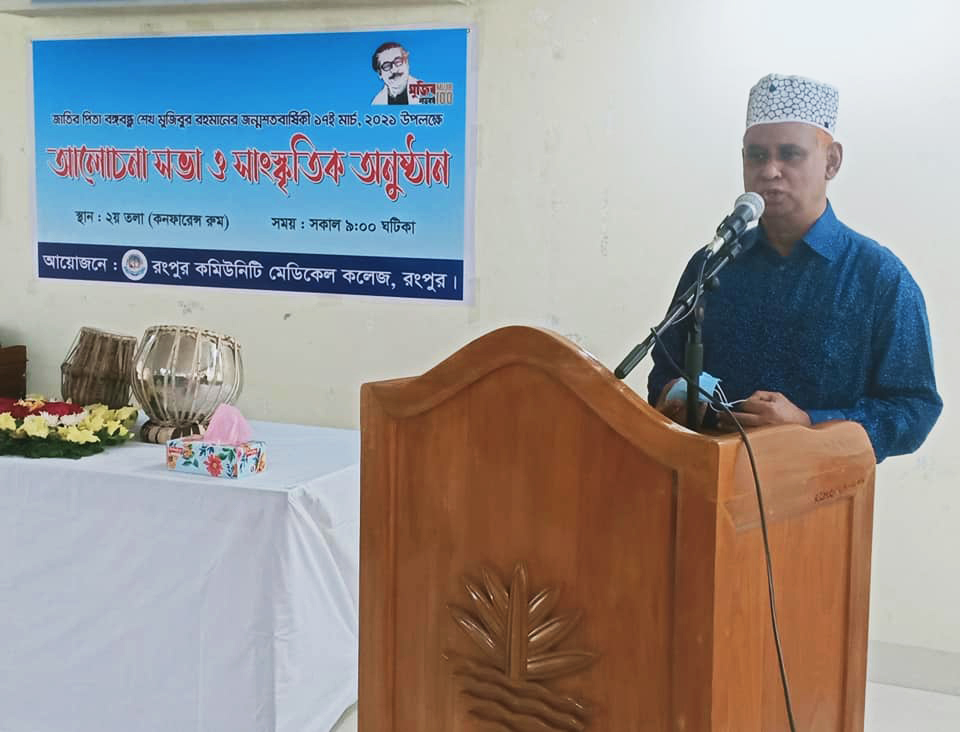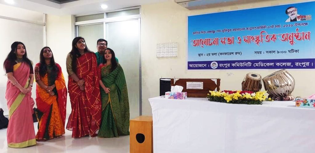 ON 17TH MARCH 2021, THE 101ST ANNIVERSARY OF THE BIRTHDAY OF FATHER OF THE NATION BANGABANDHU SHEIKH MUJIBUR RAHMAN WAS OBSERVED AT RCMC, RCNC AND RDC PREMISES WITH DUE RESPECT AND SOLEMNITY. ON THIS OCCASION, AUTHORITIES HAD BEEN ENLISTED FEW ELABORATED PROGRAMS DURING THE DAY TIME WHICH WERE INCLUDED: HOISTING OF NATIONAL FLAG WITH SINGING THE NATIONAL ANTHEM, MORNING RALLY, PLACING FLORAL WREATH, DISCUSSION AND CULTURAL PROGRAM. PRINCIPAL PROF. DR. SHAMSUZZAMAN ALONG WITH DEPUTY MANAGING DIRECTOR MD. ASRAFUL ALAM AL-AMIN AND OTHER HONOURABLE PROFESSORS PLACED FLORAL WREATH AT THE MURAL OF BANGABANDHU SHEIKH MUJIBUR RAHMAN FIRST. THEN DIFFERENT GROUP OF STUDENTS, PROFESSORS & LECTURERS, DOCTORS AND INTERNS ALSO PLACED FLORAL WREATH. A REMINISCENT DISCUSSION PROGRAM ON ‘THE BIRTH OF BANGABANDHU’ HELD TODAY AT CONFERENCE HALL IN RCMC ACADEMIC BUILDING. RCMC PRINCIPAL PROF. DR. SHAMSUZZAMAN, RDC PRINCIPAL PROF. DR. MD. HAFIZUL ISLAM, DEPUTY MANAGING DIRECTOR MD. ASRAFUL ALAM ALAMIN WERE PRESENT AS HOUNOURABLE GUESTS AND DELIVERED THEIR SPEECH. RCMC PRINCIPAL PROF. DR. AFRUZA BULBUL AKHTAR PRESIDED OVER THE DISCUSSION PROGRAM WHERE PROF. DR. M. M. A. WADUD MOSTAFA, VICE PRINCIPAL & HEAD OF PHYSIOLOGY DEPARTMENT AND PROF. DR. MD. ABDUR RAHIM, HEAD OF THE BIOCHEMISTRY DEPARTMENT WERE PRESENT AS REMARKABLE SPEAKERS. THE DISCUSSION PROGRAM WAS ALSO ADDRESSED AMONG OTHERS: ASSO. PROF. DR. SYED MAMUN, ASSISTANT PROFESSOR DR. SHAH AHASANUL IMRAN AND DR. MD. ABDUL HAKIM (HEAD OF DFM). ALL FACULTY MEMBERS, DOCTORS, OFFICERS AND EMPLOYEES WERE PRESENT AT THAT TIME.