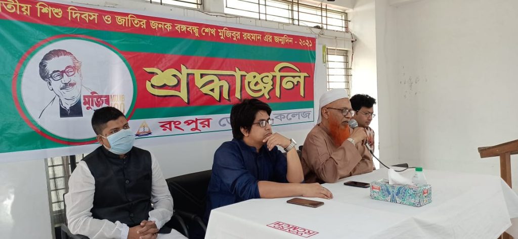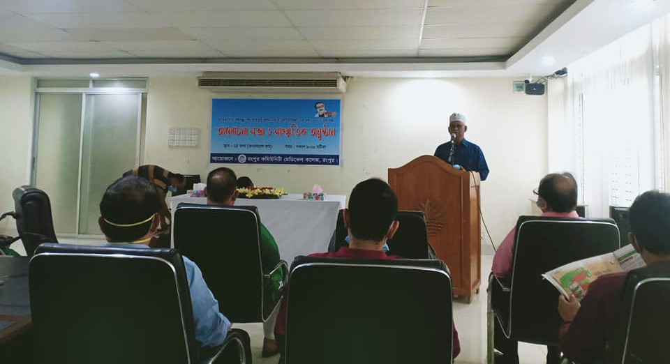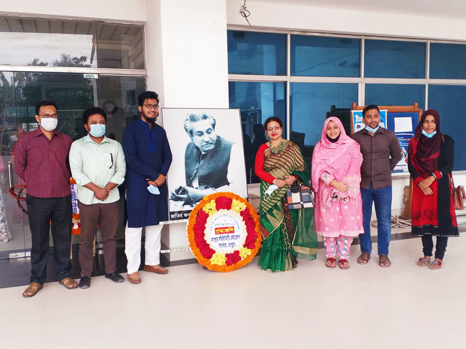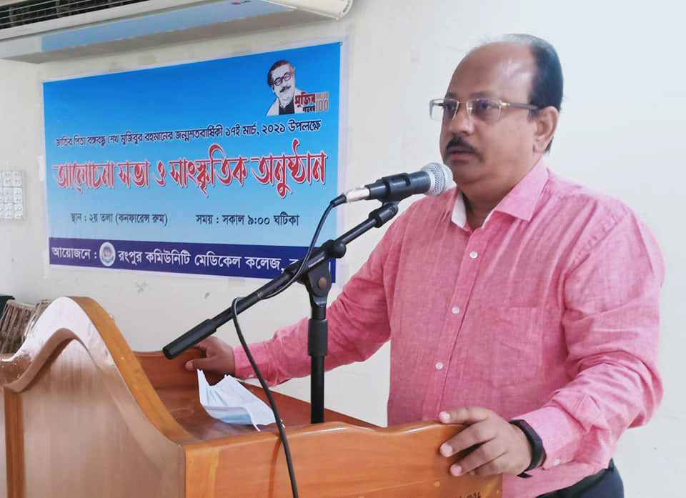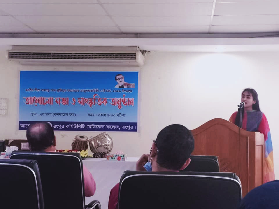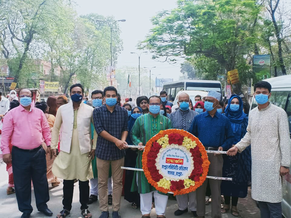 ON 17TH MARCH 2021, THE 101ST ANNIVERSARY OF THE BIRTHDAY OF FATHER OF THE NATION BANGABANDHU SHEIKH MUJIBUR RAHMAN WAS OBSERVED AT RCMC, RCNC AND RDC PREMISES WITH DUE RESPECT AND SOLEMNITY. ON THIS OCCASION, AUTHORITIES HAD BEEN ENLISTED FEW ELABORATED PROGRAMS DURING THE DAY TIME WHICH WERE INCLUDED: HOISTING OF NATIONAL FLAG WITH SINGING THE NATIONAL ANTHEM, MORNING RALLY, PLACING FLORAL WREATH, DISCUSSION AND CULTURAL PROGRAM. PRINCIPAL PROF. DR. SHAMSUZZAMAN ALONG WITH DEPUTY MANAGING DIRECTOR MD. ASRAFUL ALAM AL-AMIN AND OTHER HONOURABLE PROFESSORS PLACED FLORAL WREATH AT THE MURAL OF BANGABANDHU SHEIKH MUJIBUR RAHMAN FIRST. THEN DIFFERENT GROUP OF STUDENTS, PROFESSORS & LECTURERS, DOCTORS AND INTERNS ALSO PLACED FLORAL WREATH. A REMINISCENT DISCUSSION PROGRAM ON ‘THE BIRTH OF BANGABANDHU’ HELD TODAY AT CONFERENCE HALL IN RCMC ACADEMIC BUILDING. RCMC PRINCIPAL PROF. DR. SHAMSUZZAMAN, RDC PRINCIPAL PROF. DR. MD. HAFIZUL ISLAM, DEPUTY MANAGING DIRECTOR MD. ASRAFUL ALAM ALAMIN WERE PRESENT AS HOUNOURABLE GUESTS AND DELIVERED THEIR SPEECH. RCMC PRINCIPAL PROF. DR. AFRUZA BULBUL AKHTAR PRESIDED OVER THE DISCUSSION PROGRAM WHERE PROF. DR. M. M. A. WADUD MOSTAFA, VICE PRINCIPAL & HEAD OF PHYSIOLOGY DEPARTMENT AND PROF. DR. MD. ABDUR RAHIM, HEAD OF THE BIOCHEMISTRY DEPARTMENT WERE PRESENT AS REMARKABLE SPEAKERS. THE DISCUSSION PROGRAM WAS ALSO ADDRESSED AMONG OTHERS: ASSO. PROF. DR. SYED MAMUN, ASSISTANT PROFESSOR DR. SHAH AHASANUL IMRAN AND DR. MD. ABDUL HAKIM (HEAD OF DFM). ALL FACULTY MEMBERS, DOCTORS, OFFICERS AND EMPLOYEES WERE PRESENT AT THAT TIME.