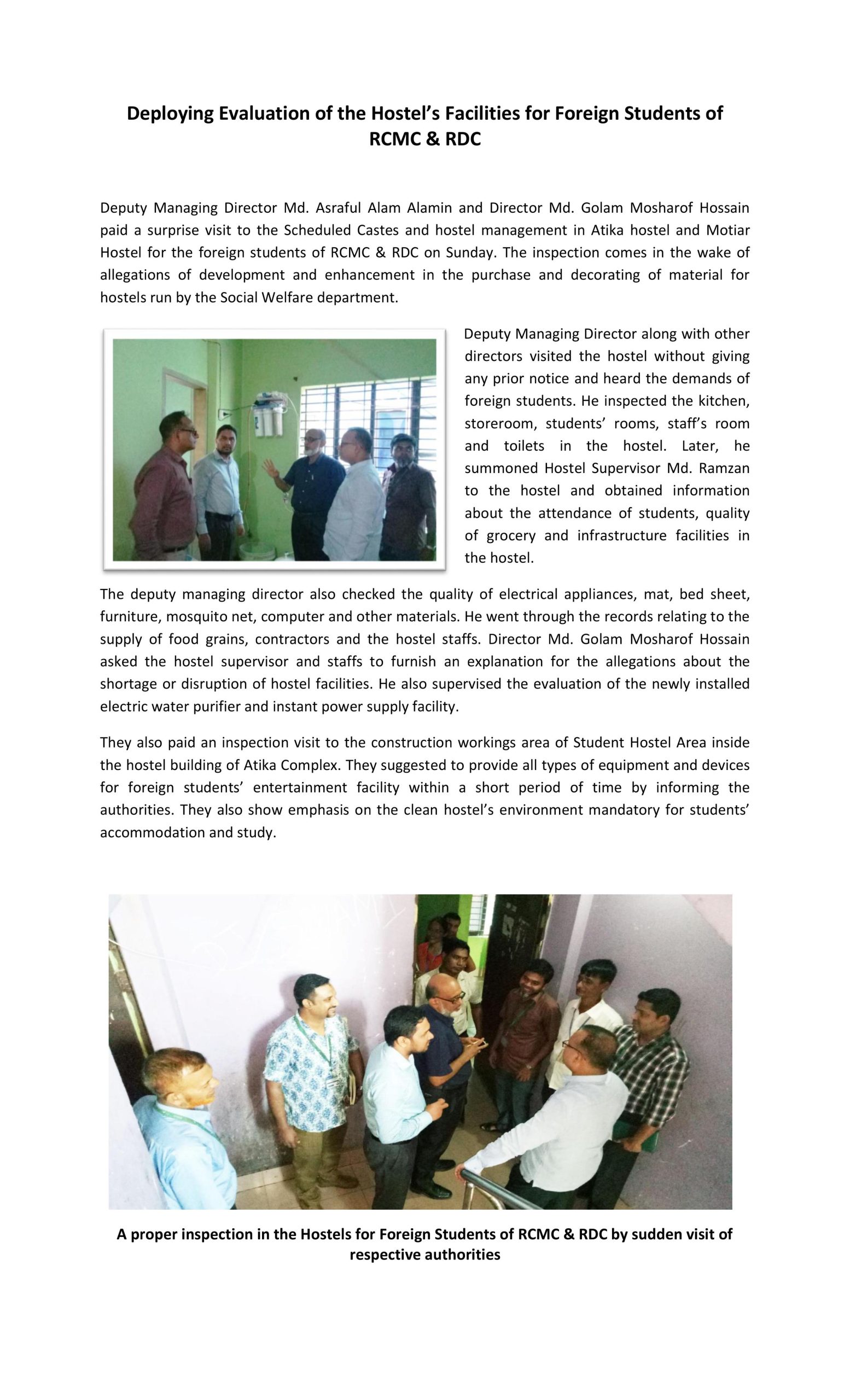 29 Jul Deputy Managing Director Md. Asraful Alam Alamin and Director Md. Golam Mosharof Hossain paid a surprise visit to The Hostels for the foreign students Posted at 09:50h in News by RDCH 0 Comments 0 Likes Tags: Directors, DMD, Foreign Students' Hostel, Inspection, RCMC, RDC