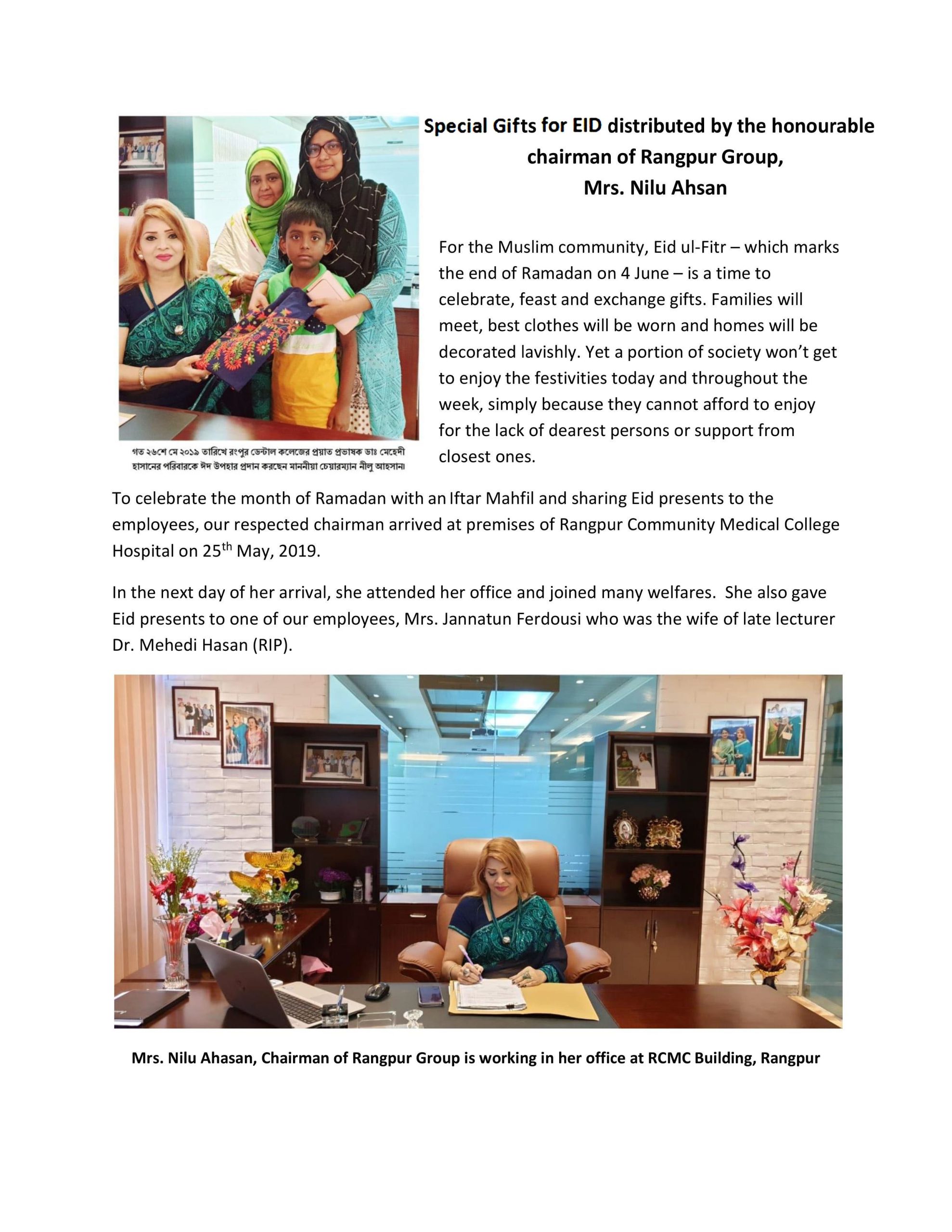 “Eid ul-Fitr is all about being together with family and friends. People greet each other with ‘Eid Mubarak’, which means a blessed holiday in Arabic. Our beloved Chairman of Rangpur Group gave Eid presents to one of our employees, Mrs. Jannatun Ferdousi who was the wife of late lecturer Dr. Mehedi Hasan (RIP).”