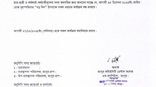 Notice of class postponed on 25th December, It is hereby notified to all teachers & students of all years that the regular classes of Rangpur Community Dental College (RCDC) will remain closed on 25th December 2025, on Christmas Day. FROM 27th DECEMBER 2025, ALL CLASSES......
