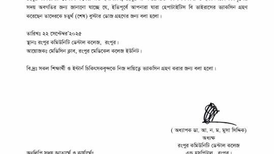 This is the information about holidays for all the students of Rangpur Community Dental College that all academic activities will remain closed on the occasion of Durga Puja from 27th September to 2nd October 2025. All classes will resume on 4th October 2025, according to......