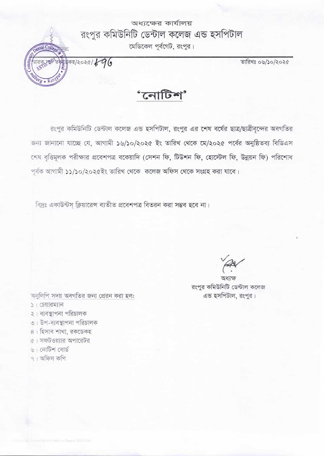 Issued by: Administrative Office of the Principal, Rangpur Community Dental College & Hospital