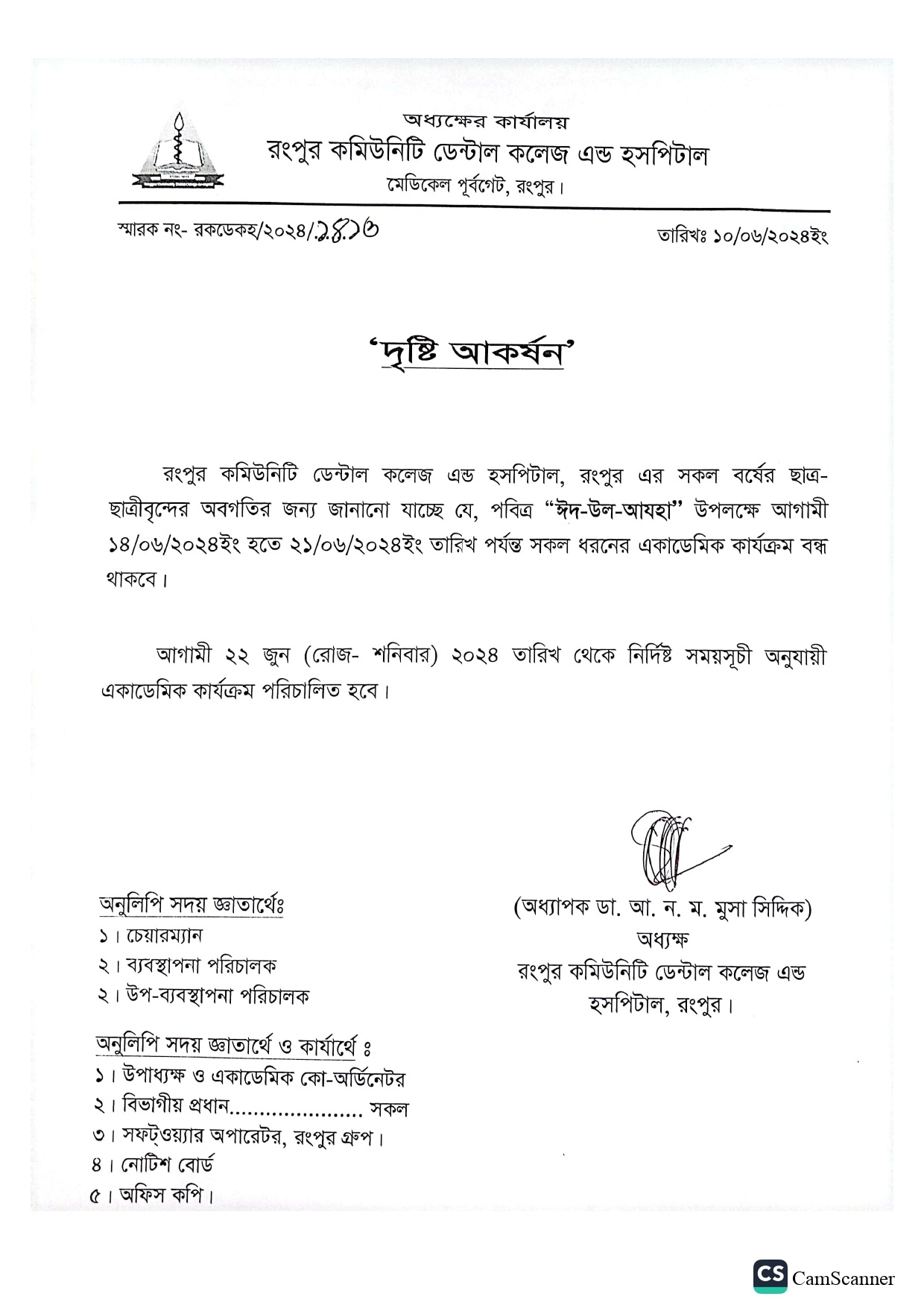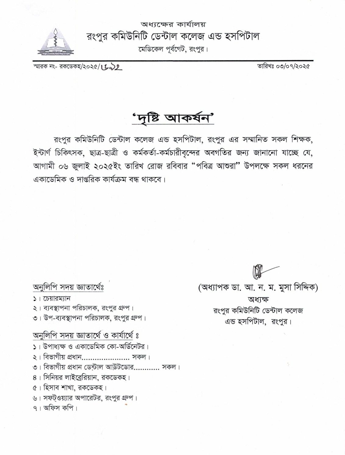 All classes of RCDC will remain suspended on Sunday, 6th July 2025 on account of ‘Day of Ashura (10th Muharram) 2025’. All scheduled classes of RCDC will be held on Monday, 7th July 2025 as usual as per Class Routines as Scheduled....