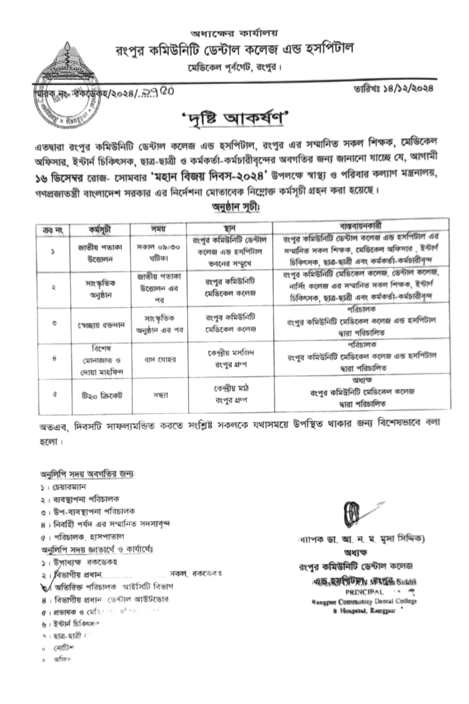 14 Dec RDC, RCMC & RCNC will observe the day of Victory Day on 16 Dec 2024