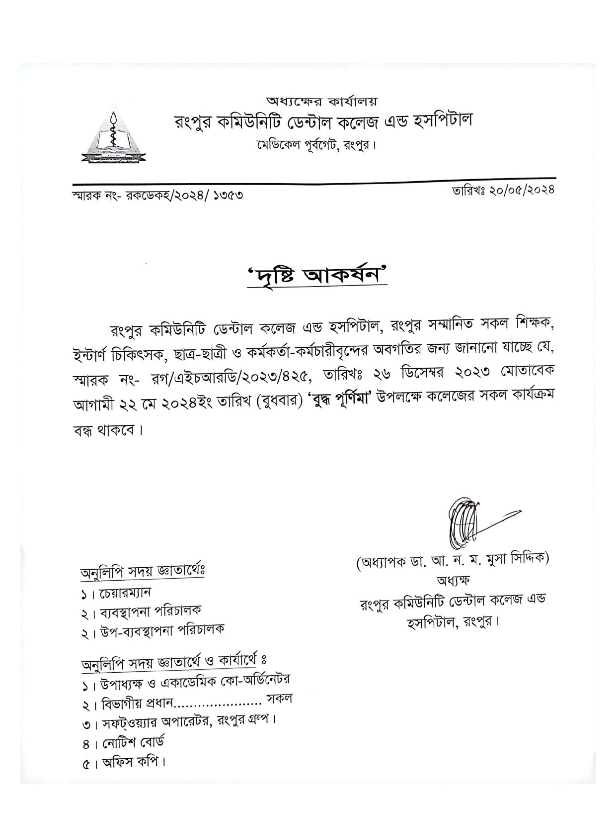 All concerned may kindly be informed that the academic and administrative activities of Rangpur Dental College will remain closed on 26 March 2023 on the occasion of the Independence Day of Bangladesh. Proper cultural activities will be organised to celebrate our Independence Day on 26th...