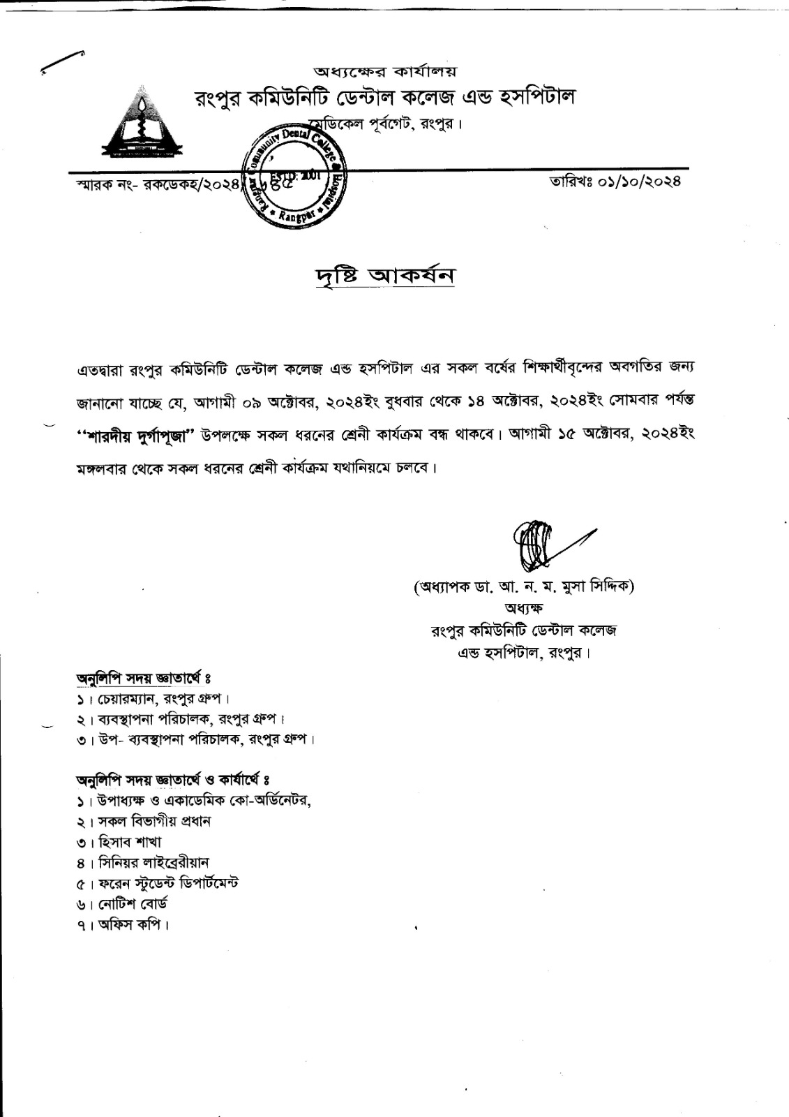 This is the information about holidays for all the students of Rangpur Community Dental College that all academic activities will remain closed on the occasion of Durga Puja from 27th September to 2nd October 2025. All classes will resume on 4th October 2025, according to...