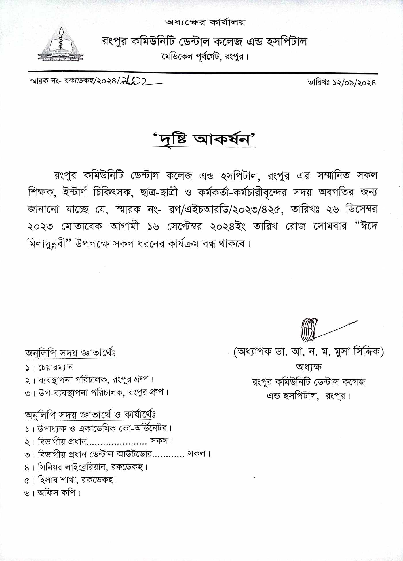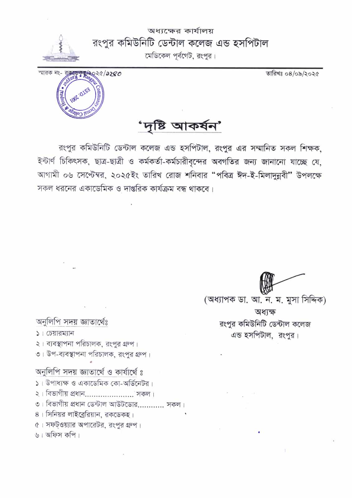 For the holiday of Eid-e-Miladunnabi, all scheduled classes will remain closed on 6th September 2026. The regular in-person and other online classes and all tutorials for clinical practices will be resumed on 7th September 2025. The next scheduled classes according to the respective Class Routines of RCDC...