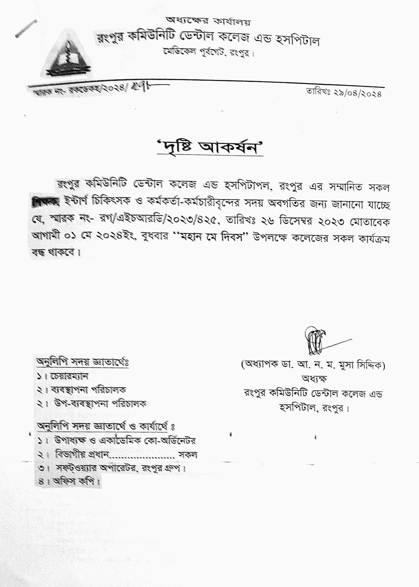 For the holiday of International Labour Day, all scheduled classes will remain closed on 1st May 2025. The regular in-person and other clinical classes and all tutorials will resume on May 3, 2024. The next scheduled classes according to the respective Class Routines of RCDC will be...