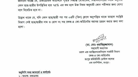 Issued by: College Administration Office of Rangpur Community Dental College & Hospital Date: 05 October 2025 All 4th-year students of Rangpur Community Dental College & Hospital are hereby informed that according to the University regulations and academic college policy, students must maintain a minimum of......