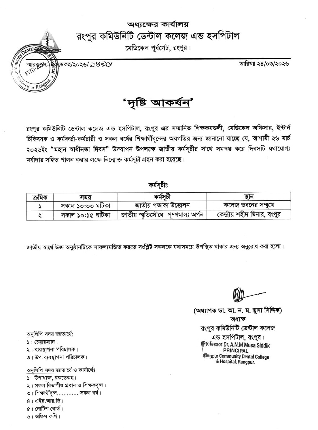 All concerned are hereby informed that the academic and administrative activities of Rangpur Community Dental College will remain closed on 26 March 2026 (Thursday) on the occasion of the Independence Day of Bangladesh.