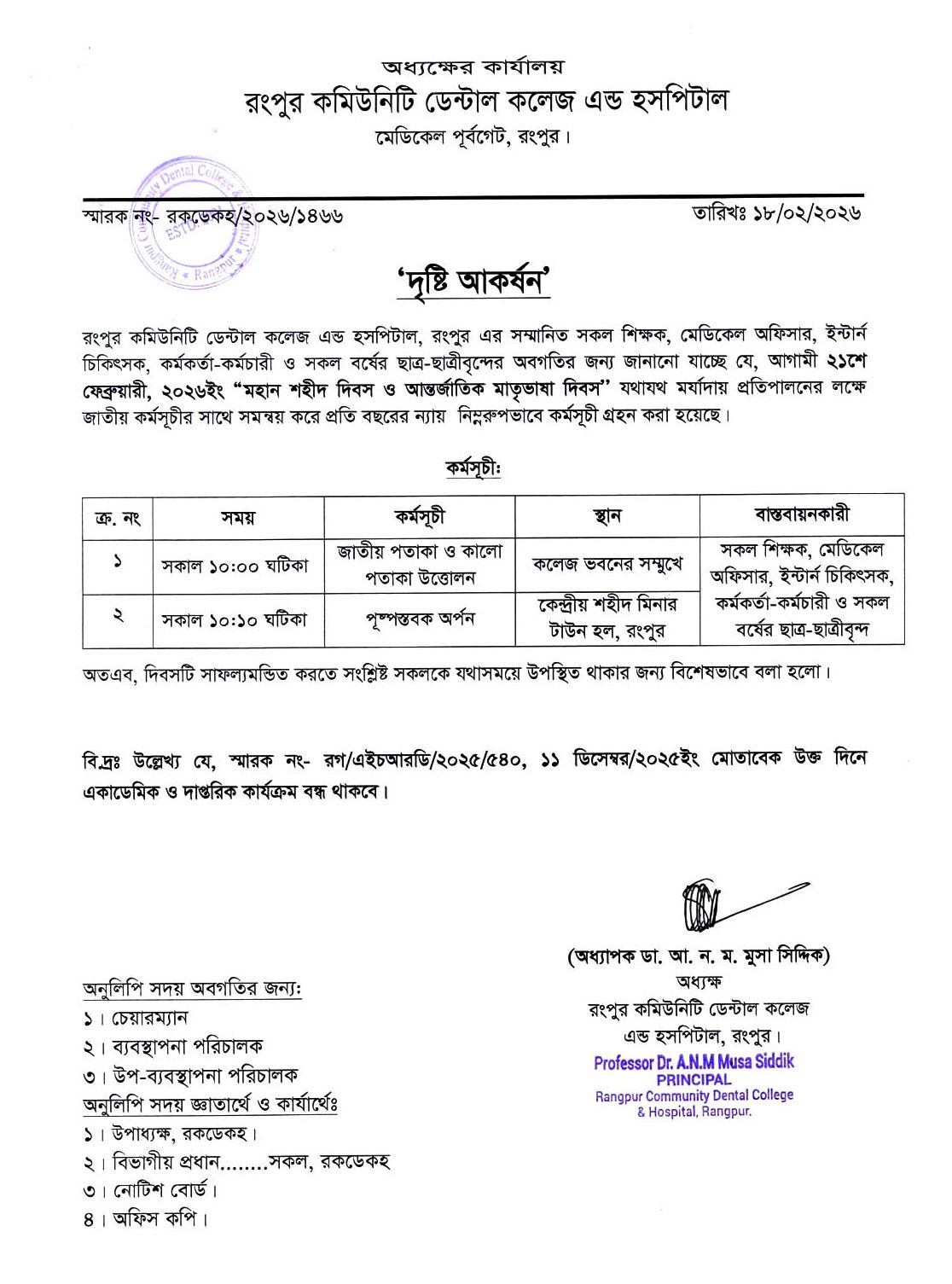 On 21st February, Rangpur Community Dental College & Hospital will arrange an event to honour the sacrifices of our martyrs who fought to attain the recognition of our mother tongue.